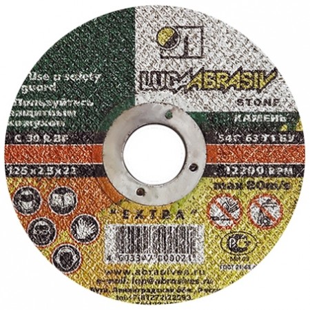 Круг отрезной армированный изготовлен из оксида алюминия на основе бакелитовой связки с армированием.